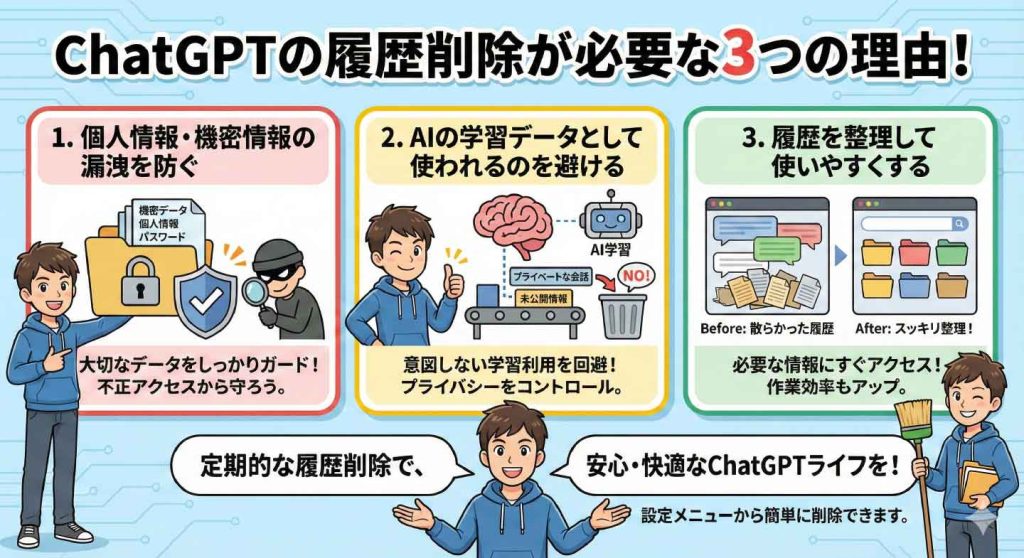 まず、なぜChatGPTの履歴を削除する必要があるのか、その理由を理解しておきましょう。履歴削除が重要な理由は大きく3つあります。